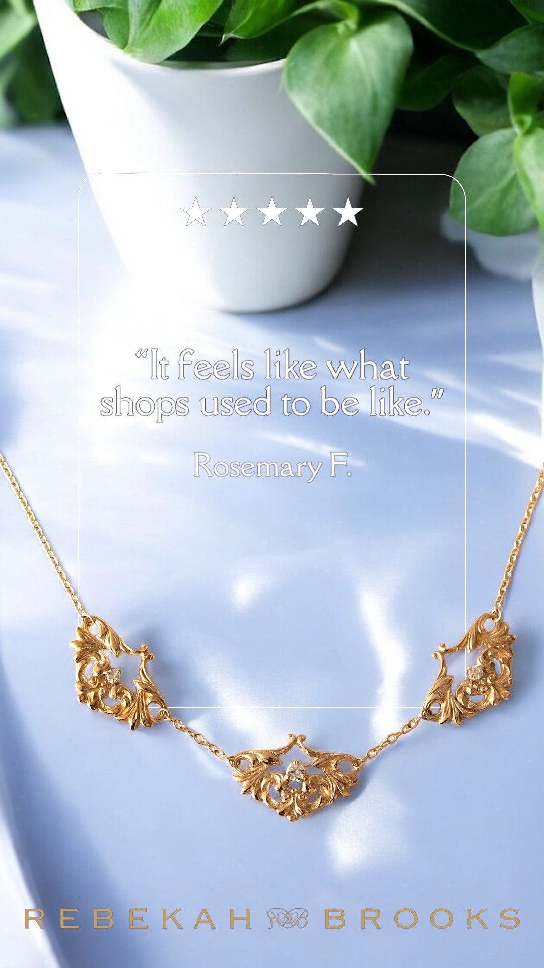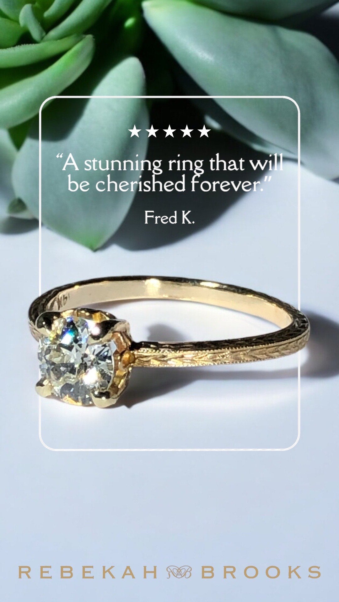 “Thanks to Rebekah Brooks and the warm, wonderful and gracious women at the Cambridge location, I have the most beautiful engagement ring sparkling on my finger, distracting me all day long! My now-fiance worked with Rebekah on the ring of my dreams, and the whole process was smooth and terrific. We both loved that Rebekah Brooks is female-founded, local, and uses ethical antique gemstones. It's a meaningful and special token of our love that I can feel so good about. I am so in love with him and my engagement ring is a reminder of that love every time I look at it. Thank you so much for being part of our love story!”